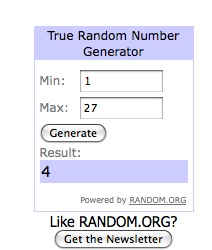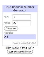 My methodology: I numbered all the blogger comments 1-22, then the four comments I received over on Goodreads 23-27, then hit the ol' Random Number Genetator. (And yes, I included those of you who skated in under the wire this morning and no one got entered twice.)