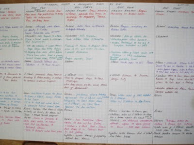 It is broken down by act, and thank God they make eight different colors of ink or I would never have gotten it all in there. The green and purple ink are two characters I totally made up for this story, while the rest represent actual historical people who were alive and involved in these events. I can't ...