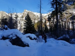 Blodgett Canyon is one of the most popular trails in the Bitterroots, so the snow on the trail was packed down, making travel easy. There were some icy spots, so I kept my microspikes on. A few miles up the trail, we reached the jumping off point for the research site.