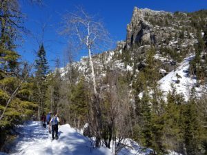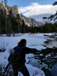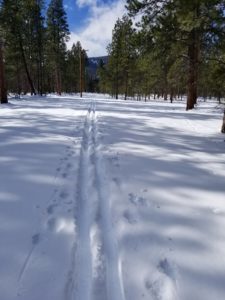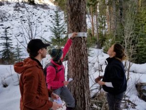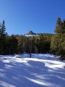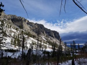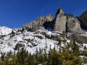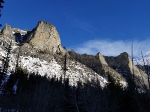 Blodgett Canyon WallFirst, I went with my assigned group to check on the Fisher research camera up Blodgett Canyon. It was a beautiful bluebird day, a little chilly to start, but bright and sunny. We reached the site fairly quickly, only needing snowshoes the last mile or so. The camera snapped lots of Marten pictures and a few of a cantankerous squirrel who seemed determined to eat the camera itself. The return trip was a little slower. The snow softened up enough that we needed snowshoes the whole way back, which makes for a great workout. We also saw a moose on the way back–too far away for a good picture, sorry! But that’s a lot safer for us–moose can be very dangerous.