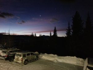Sunrise over the Colorado MountainsWhile we love our little Lost Trail Ski Area, the Colorado resorts have much longer runs, more terrain, and faster lifts. It’s great to revisit our old haunts, too. We stayed at a condo in Silverthorne and skied at Keystone, Breckenridge and Vail. At the beginning of the week, the snow wasn’t great, but the days were sunny, almost too warm, and the runs nicely groomed at Keystone and Breck. There were way more people out there than we’re used to, though.