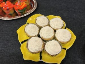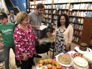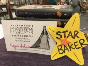 Years ago when I was first drafting MIDSUMMER’S MAYHEM, little did I know that I would get to go to a fabulous independent bookstore and hold A Kids’ Baking Contest inspired by my book! That’s what happened today, and it was more fun than I could have envisioned. I spoke about and read from MIDSUMMER’S MAYHEMA, and then twelve young bakers brought in exquisite, creative baked goods to be tasted by me and two fellow judges. We were blown away by these young bakers’ skills and vision, and it was incredibly difficult to decide on the winners! The winning entry: delicious and incredibly inventive lemon bars with white chocolate and mint! The young baker got to take home a big basket full of equipment and ingredients to make several MIDSUMMER’S MAYHEM recipes!! Second place: exquisite lemon cupcakes filled with perfectly tart lemon curd. Third place: a towering, impeccably moist chocolate pumpkin cake!! A wonderful time was had by all!!