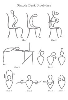 SeatedCat-Cow Back Stretches - (illus. 1) Sit tall towards the front of yourchair. Inhale into a gentle backbend. Look up. Exhale and let the back roundfrom the base of the spine to the crown of the head. Keep moving back and forthwith the breath. ForwardBends - Bending forward stretches the back and shoulders and lowers your head below yourheart to bring blood to the brain for a quick pick-me-up. See more forward bendillustrations in Easy Yoga Poses (page 83).•Push back from your desk. Sit near the edge of your chair.Legswide, feet on the floor. Inhale. Reach arms up or rest your hands on yourknees. Exhale and hinge forward. (If necessary use a pillow on your lap for support.)Keep the spine extended. Relax. Take a few deep breaths. Try to let your head hanglower than your hips. Continue slow deep breaths. When ready, use your hands tosupport you back to sitting.•Move the chair further back. Sit with legs wide. Straighten arms and place palmson desktop. Hinge forward from hips. Keep back long and straight and shouldersextended in a comfortable stretch. Allow head to hang slightly lower thanshoulders. Breathe.•Stand an arm's length from your desk and place hands on the desktop. (illus. 2)Hinge forward from hips. Keep back long and straight and shoulders extended.Take slow deep breaths. NeckStretches -(illus. 3)•Sit tall. Imagine the crown of your head reaching towards the ceiling. Inhale.Slowly rotate your face up, keeping the feeling of length in the neck. Exhale,bringing the chin towards the chest. Repeat, slowly, three times. Next, elongatethe neck, exhale, moving your right ear in the direction of your right shoulder.Inhale back up. Alternate sides.•Imagine a pencil balanced (point up) on the top of your head. Sit tall in yourchair. Keeping the upper body still and your neck relaxed, write your name on theceiling (or the clouds). Jaw& Face - Press the tongue lightly against the roof of your mouth behind the frontteeth. Allow lips to part slightly. Open mouth as wide as you can. With mouthopen, lightly press fist under chin and use jaw to press down. Repeat. Arms - (illus. 4)Sit up straight. Raise arms over head. Clasp hands and stretch up, liftingtorso out of waist. Reverse hand position so palms face the ceiling. Take threeslow deep breaths. Release. (illus. 5) Stretch arms out to the sides.Alternatively rotate one arm forward and one backward. Next, flex one palm upand the other down. Alternate.
