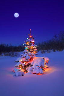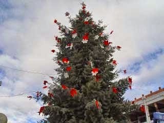I wrote this in 2001. Since then the trees don't appear. The nature-loving people of Sedona have stopped decorating forest trees for fear birds will be attracted to the glittering decorations, eat, and die. So let's keep our trees indoors or with animal friendly decorations.