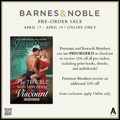 We interrupt your regularly scheduled Wednesday with some exciting news! Barnes & Noble is having a Pre-order Sale today, tomorrow and Friday! It’s the perfect time to pre-order your copy of THE TROUBLE WITH INVENTING A VISCOUNT.