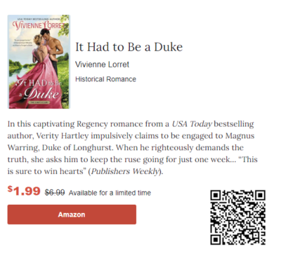Here is the link to get the deal before it’s gone: https://www.bookbub.com/books/it-had-to-be-a-duke-by-vivienne-lorret?ebook_deal