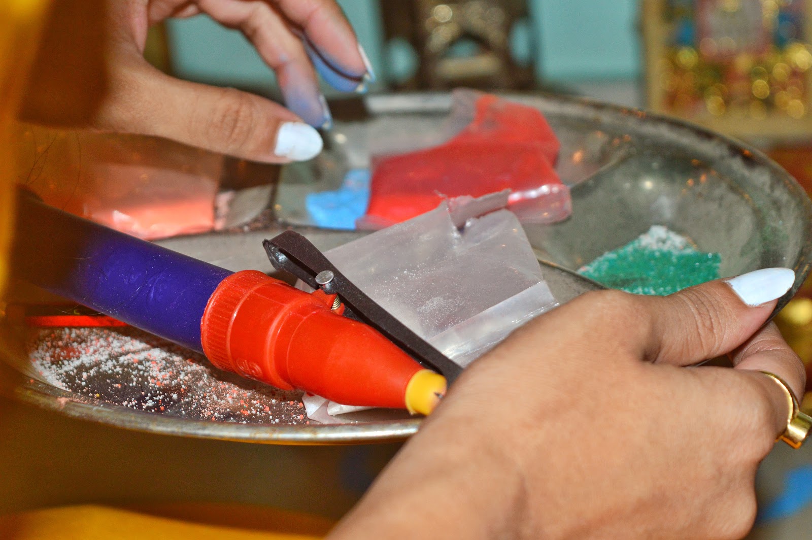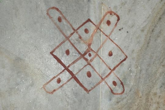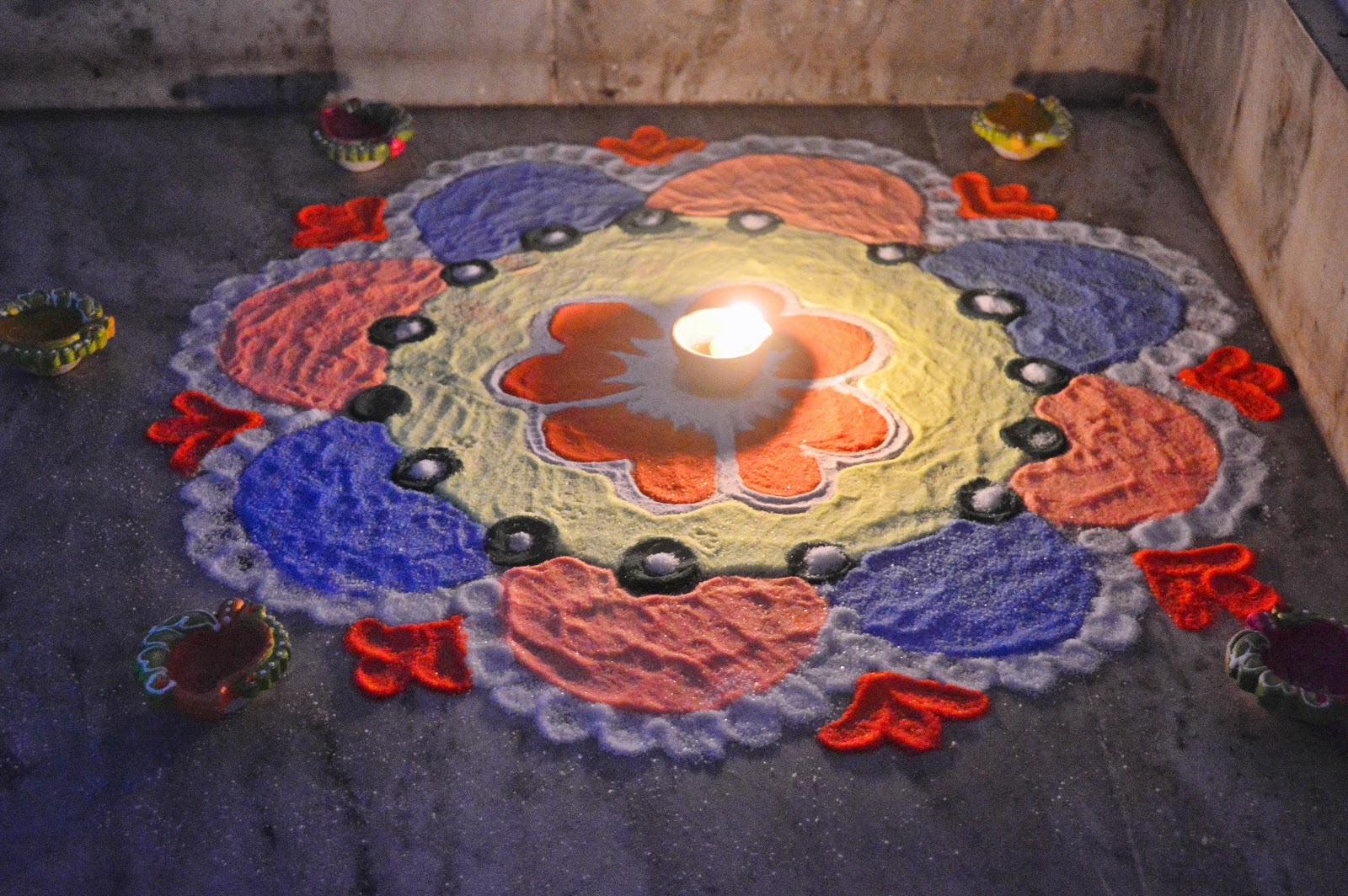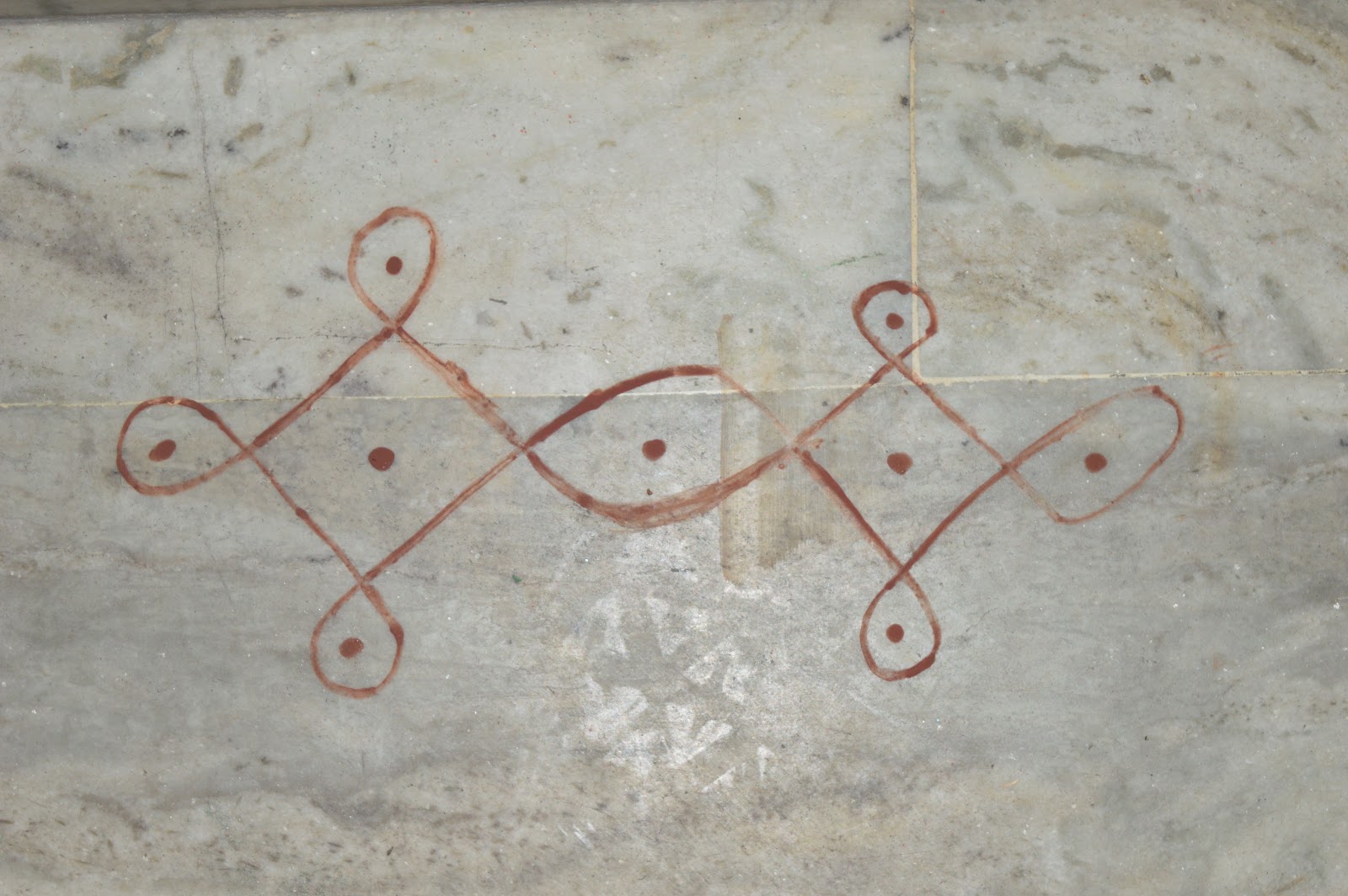 As per Guruprasad.net, "The harmonic vibration patterns manifests into pleasing sounds which can soothe the mind. Similarly, in the visual domain, we have corresponding harmonics for every frequency which when combined, leads to artistic patterns which are pleasing to see and have a calming effect. " In simpler words, Rangoli is a pictorial representation of harmonic sound waves, which when seen can calm the mind.I used Geru (Ochre) to make the rangoli, it is a clay which has a high amount of iron oxide.