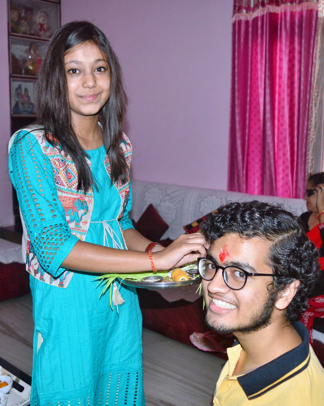 On Bhaiya Doj, sisters paste vermilion on their brothers' foreheads and then further stick rice on them. Brothers give cash or kind to their sisters after which the sisters feed them with any sweet and gift raw coconuts (gole) to them.Our Bhaiya Doj CelebrationYesterday, my maternal uncle arrived with his children. We got a lot of pictures clicked. A few of them are there. Yesterday, my camera got no chance, my sisters as well as my cousin have got their new phones this diwali so everyone was interested in experimenting with their own. Let me tell you the camera and phones we used to click the pictures this diwali.Mom- Oppo Reno 2Z (Click here to check it out)Palak di- One Plus 7T (Click here to check it out)Shreya Di- One Plus 7 (Click here to check it out)Gopal- Iphone 11 (Click here to check it out)Me- Samsung J8 (Click here to check it out) and Nikon D3200 (Click here to check it out)Unfortunately I seriously have no account as to which picture was taken from which phone as we made a whatsapp group in which each of us shared our pictures so they were all mixed up.