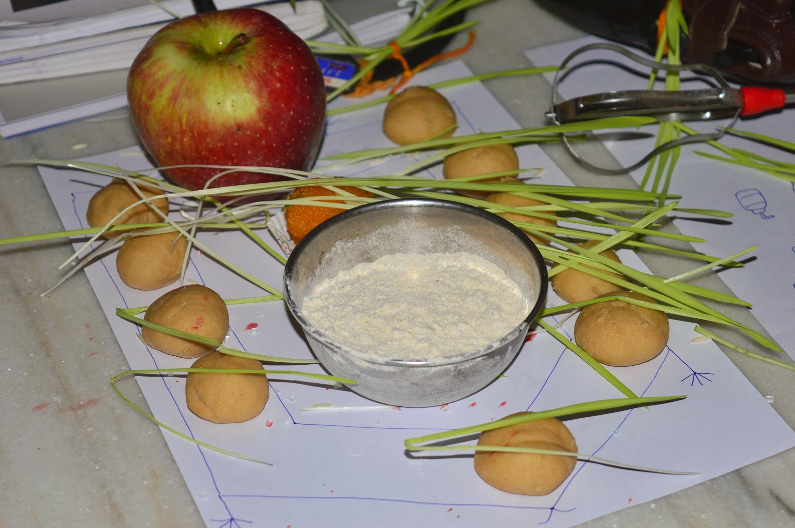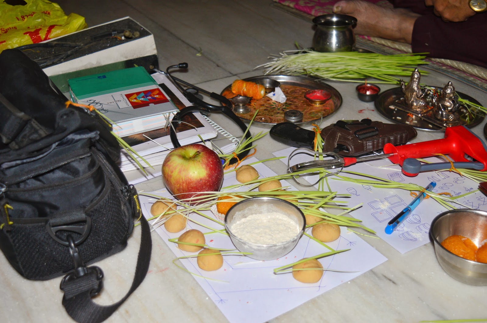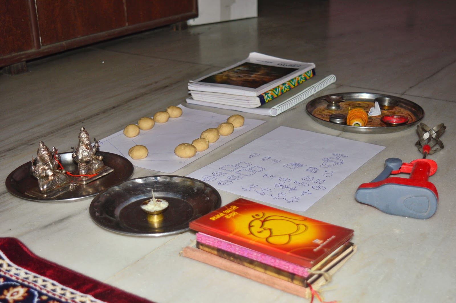 Dussehra or Vijaydushmi is a festival which is celebrated on 10th day of the shukl paksh of the hindi month 'Ashwin'. On this day, Lord Rama killed Ravana. Many people in entire Hindu prominent regions burn effigies of Ravana to celebrate the victory. Since my Dussehra holidays are going on, I'm still at home. Moreover, I can now feel the creative juices flowing again in my brain. That's why I'm writing this blog post.In this post, I suppose to tell you how is Dussehra celebrated in North Indian Households. Though, this is not completely practical to say that these traditions are in every home, as the customs may vary from community to community and caste to caste.What I'm explaining to you is based on how North Indian Baniyas/Vaniks/Vaishyas (Synonyms for the corporate community of India) celebrate Dussehra.First of all, A symbolic image of Lord Rama is drawn. Traditionally, it is drawn with flour on floor or any flagon. But, since, nowadays, everyone is busy, the same figure can be drawn on a paper with pen.On the figure, 10 balls made of cow dung are kept. In absence of cow dung, Wheat flour balls can be kept.As Dussehra succeeds Navratri, during Navratri grass of either wheat or barley is grown. They are then kept on the balls.On another paper, Ram, Lakshman, Bharat and Shatrughn are drawn symbolically.Some strands of grass are kept in the books and tied with the weapons as well.Lakshmi ji and Ganesh Ji are worshipped as well.