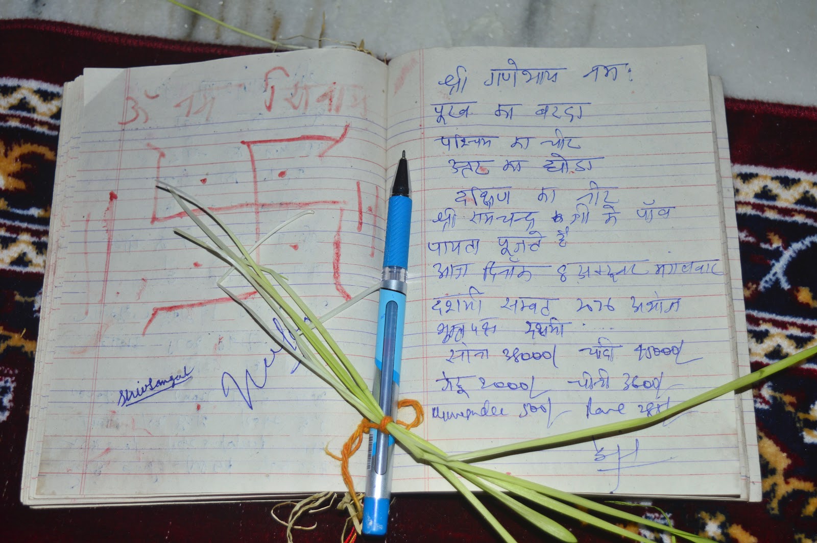 Dussehra PoojanAfter the puja, a parikrama is done around the pooja sthan. A diary is maintained on which every Dussehra the then prevalent rates of some commodities are mentioned. The signatures of all the present family members are recorded. This practice is really beneficial, and we can trace this tradition to our ancestors ideology of keeping regular economic and genealogical record.