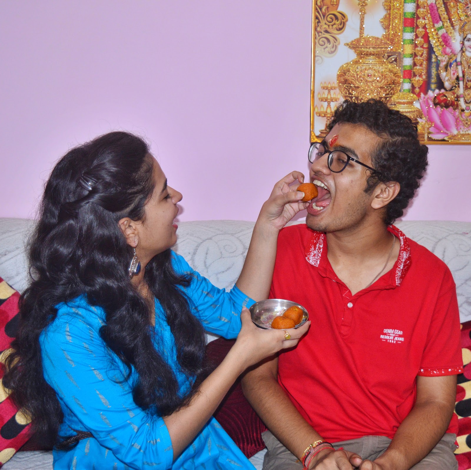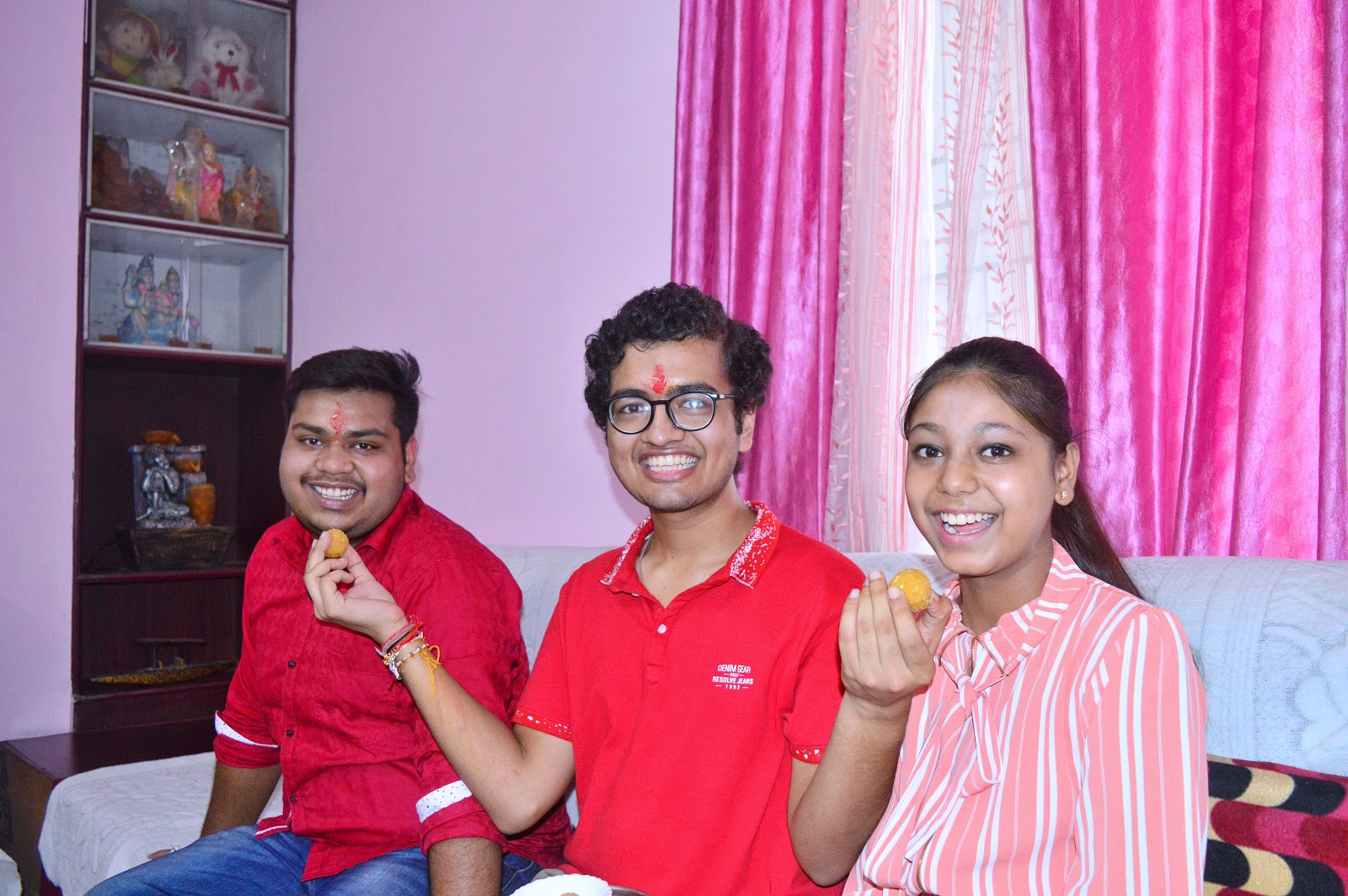 Festivals are quite enervated these days. There is a severe lack of hustle-bustle around. Many students who are distant from their homes are unable to manage to come back for just a one day holiday. These days puris and desserts are not made basket fulls because of the health concerns of the middle aged and the elderly. So, it's the need of the hour to find some new ways of celebrations.I know I'm posting the updates of our Raksha Bandhan Celebrations quite late as this year it was on 15th August 2019. On the same day falls Independence Day of our country.This year, my elder sister was 1000 kms away from home due to being engaged in a workshop. My second sister tied her own rakhi and then tied her rakhi on her behalf while associating with her through a video call.My paternal uncle from Delhi had brought with him two rakhis, his daughters sent for me. My second sister tied them as well.My maternal uncle came to visit us with his son (Gopal) and daughter (Parkhi). Parkhi tied me her rakhi. My mom and my sister tied Gopal their rakhis.Overall, it was a good event. Mom made