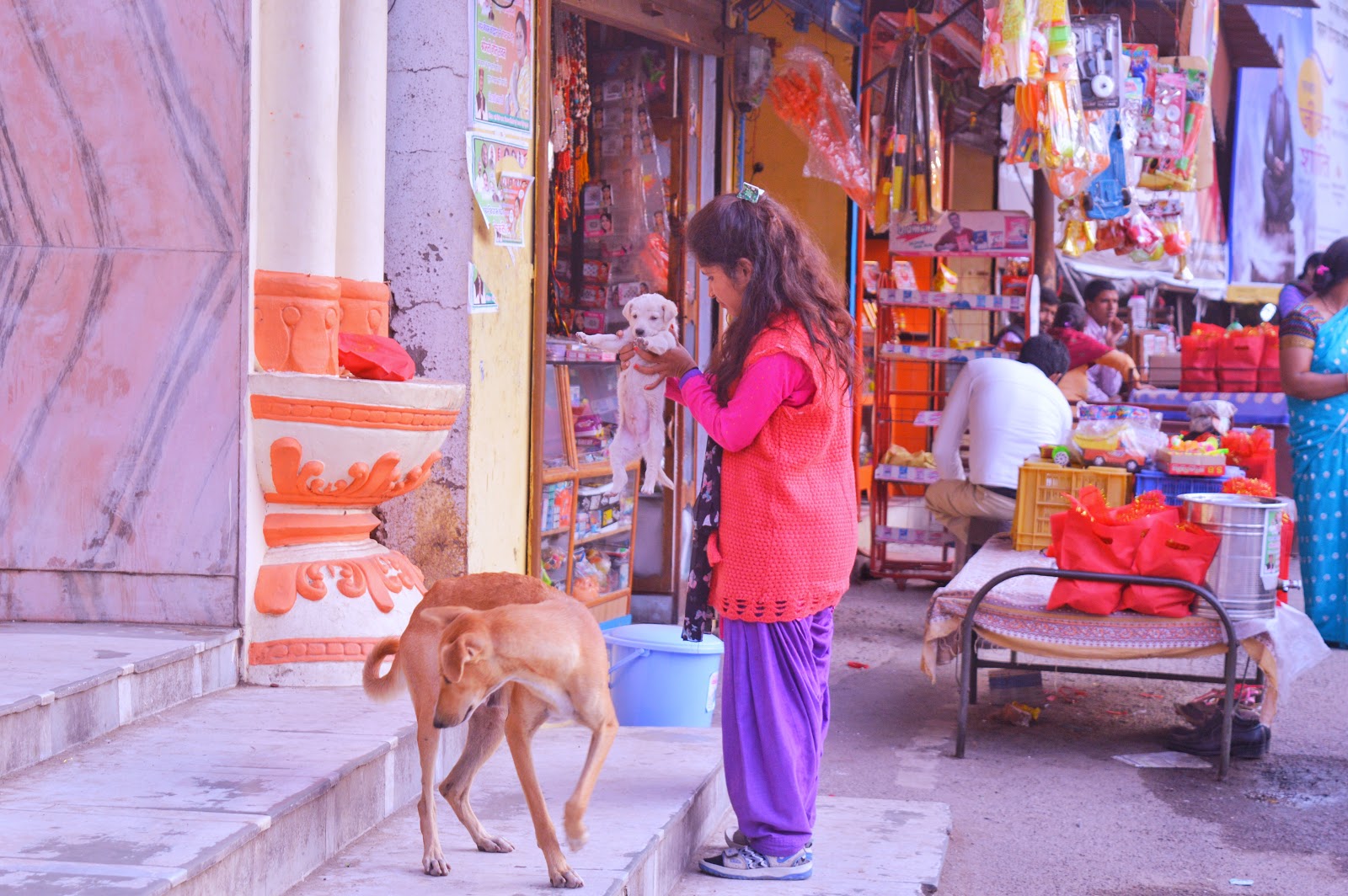 A woman lifting a puppy on the gate of Sidhbali Temple.