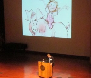 Perhaps one of the most important speeches of the Mazza Fall Weekend, Eugene Yelchin shared a childhood that no American child could possibly understand if not for his willingness and ability to share it in words and pictures. Eugene Yelchin’s Breaking Stalin’s Nose won a Newbery Honor in 2012. The book’s emotional ties to Eugene’s Russian Jewish childhood are woven throughout, bringing to young readers a world previously unknown.