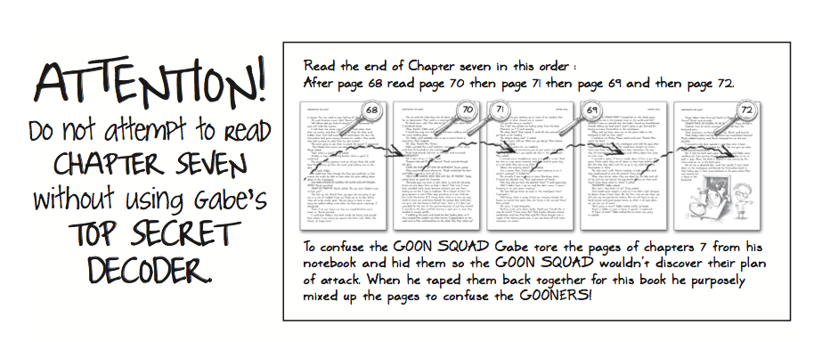 In an attempt to fool The Goon Squad, Gabe mixed up his journal, just in case they found the plans that were coming up to do a SUPER prank! If you have the book, check it out, Chapter 7 holds MUCH mystery and the way it is put together is simply GENIUS... ahem, uh, okay.... thanks for reading!