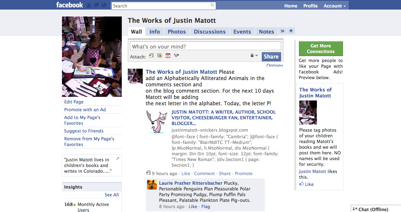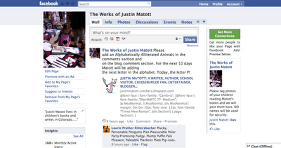 Alliterated Alphabetical Animals are catching on. At the Facebook page, they are chiming in already, check it out http://www.facebook.com/profile.php?ref=profile&id=1016679907#!/pages/The-Works-of-Justin-Matott/213624096290