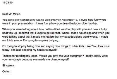 Sometimes our "jobs" can seem hard. There are times when the part of my job; visiting schools, is exhausting and leaves me wondering if I am leaving behind something that is worthy of the school's efforts to host me. THEN, I get a gift like this letter and it re-energizes my batteries and makes me want to do more.