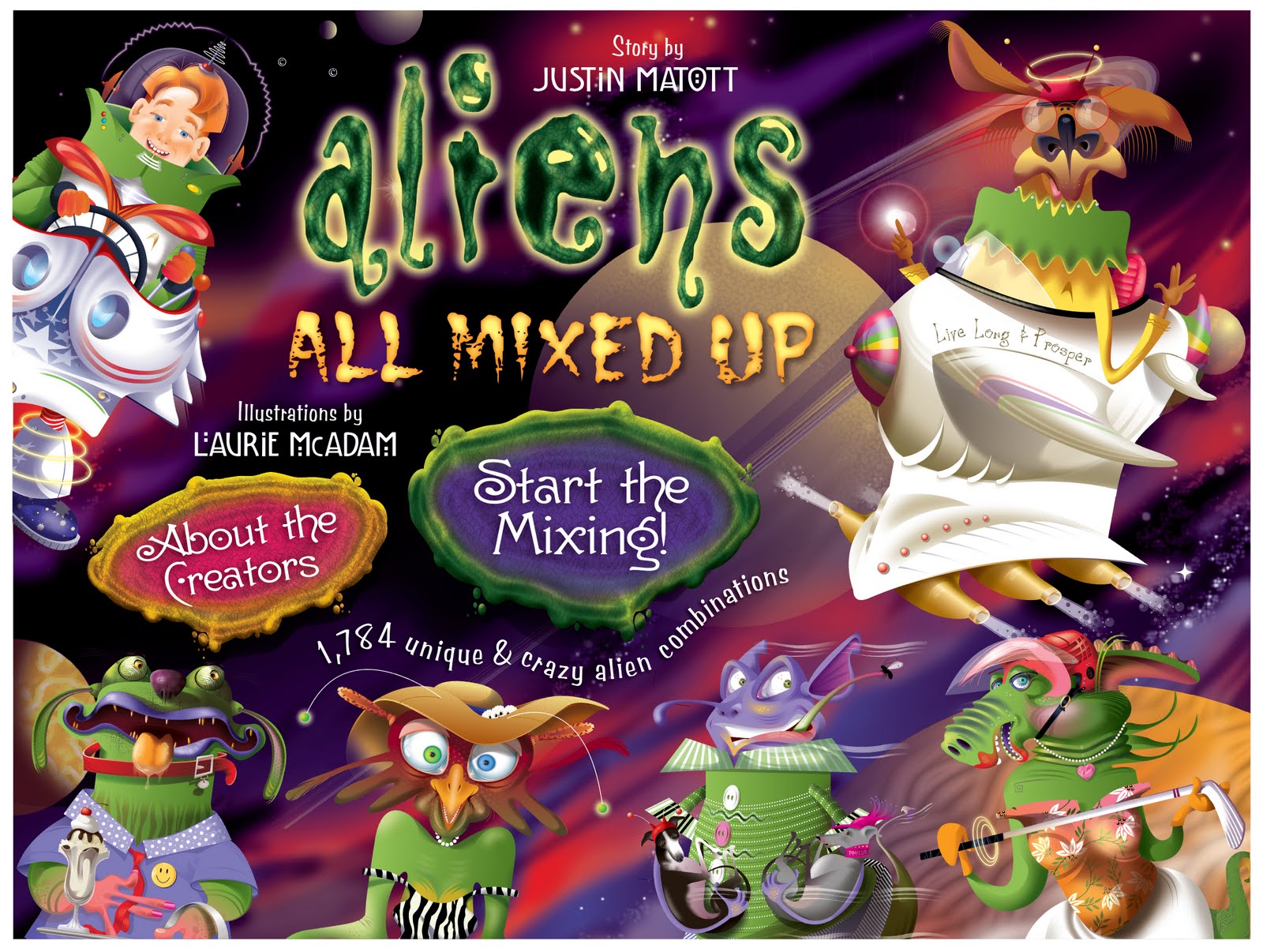 If you would still like to get some of the hardcover copies you can order them directly off my website; www.justinmatott.com and they will come autographed. The All Mixed Up feature flips into 1728 different Alien combinations and on the iPad the reader will be able to slide different tops, middles and bottoms into place to make for a delightful (and in the back seat of the car, time eating, sibling not fighting, fun to f