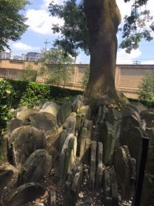 Just around the corner from St Pancras and Kings Cross stations is the quiet and shady haven of St Pancras Old Church. It’s a fascinating building and grounds, whether you are religious or not, and was also a pleasantly calm and cooler escape from the jostling city on a extremely hot day. Among the grave markers and monuments grows an Ash tree. Now circled by railings around its base are circles of headstones, stacked and scale-like as they stand close to their next.