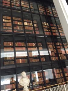 It is almost with shame, dear reader, that I admit I had never been to the British Library until this weekend. I’m not sure how this happened, or rather hadn’t happened, but I’m glad that first visit has now taken place! Another calm and cool escape on this hot and busy day – the marble floors and air con was welcome but the impossible height of the open atrium inspired wonder as soon as I stepped through the doors.