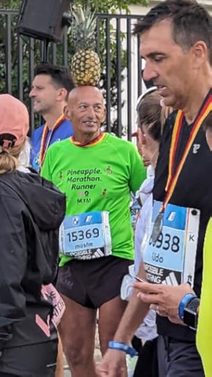 Moshe Lederfien, the Pineapple Marathon Runner, at the Berlin Marathon Finish (photo by the author)His name is Moshe Lederfien and he is world famous for running entire marathons while balancing a pineapple on his head. He calls himself the Pineapple Marathon Man.