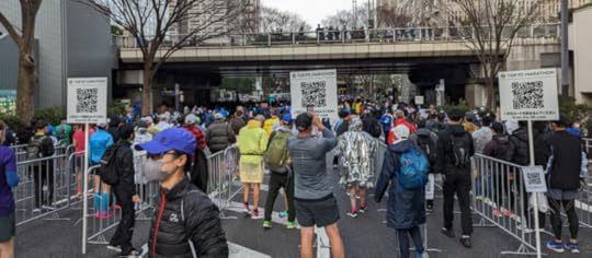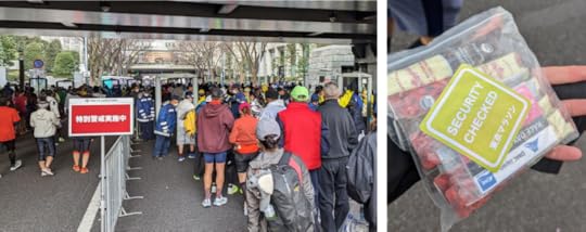 The finish area had some other lovely surprises. It was much better than 2022. For example, as is typical, volunteers handed out foil blankets to the chilled runners. As an added courtesy, though, runners were encouraged to turn their backs to the volunteers to allow them to drape the blankets around the runners’ shoulders. And a few steps later, another group of volunteers had the job of securing the blankets in place using tape thus freeing up the runners’ hands.