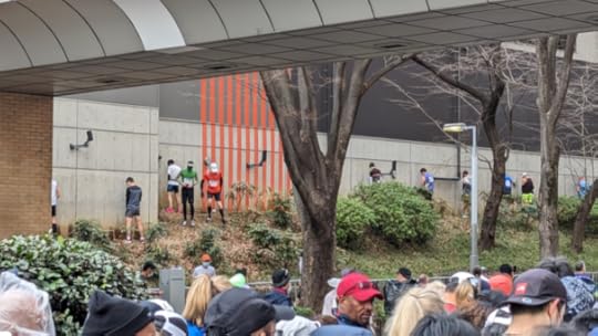 Before it died, the tracker had me running at about 9 minutes per mile. Mile markers were set up on the course. She did a quick calculation then found a relatively uncrowded spot that was just shy of the Mile 18 marker.