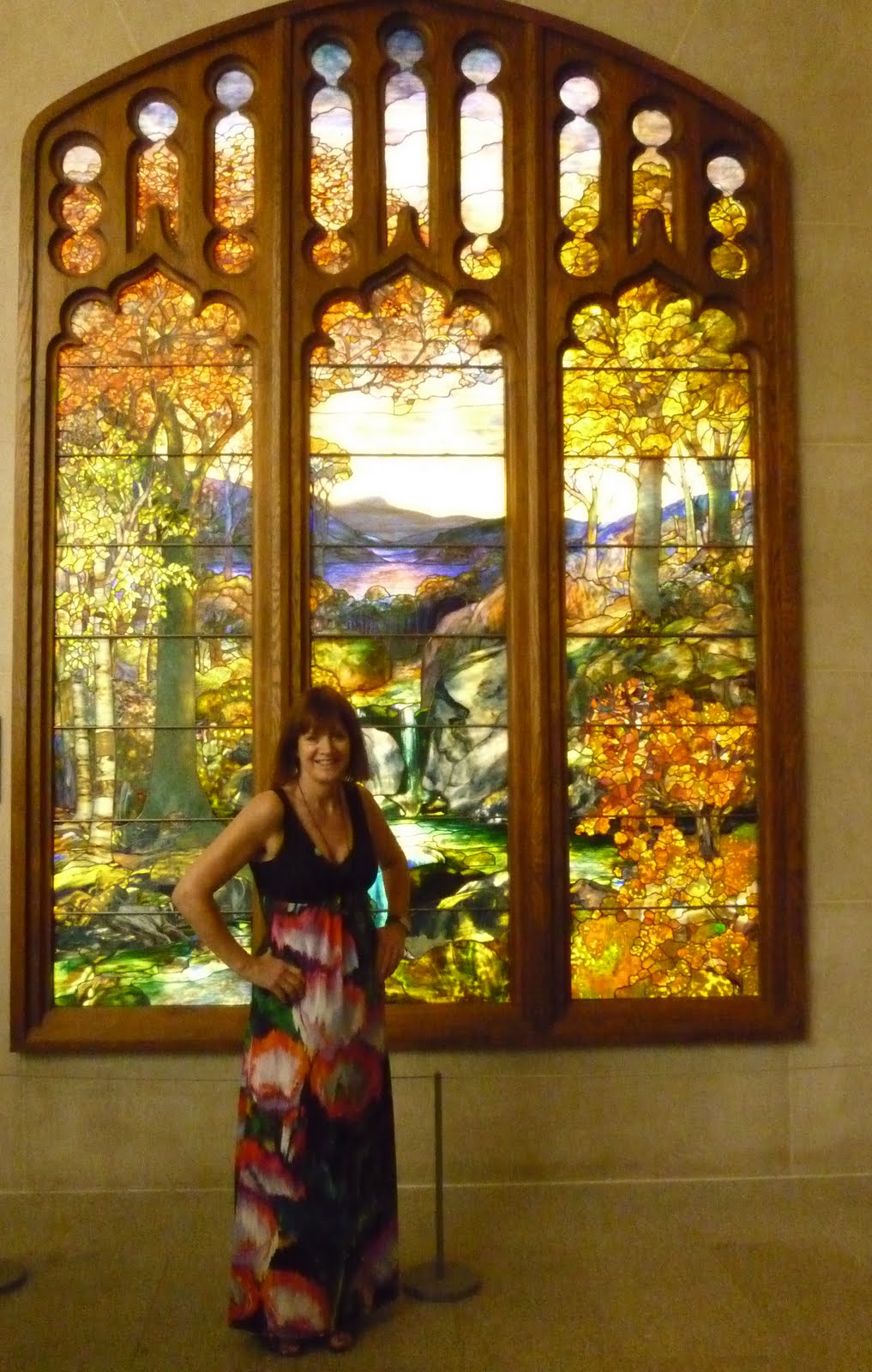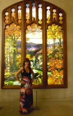 Here I am, standing in front of an exquisite pastoral stained-glass window.