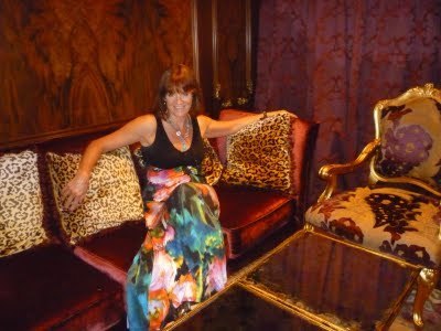 And this is me in the same hotel two days later, when I blagged my way in to use the wood-panelled washrooms and couldn't resist reclining on this completely OTT leopard-skin covered sofa..... Thanks to Sarah Morgan for taking this photo, even though she was fearful we were going to be turfed out any second!