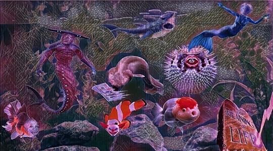 The Meaning of Life 2 by Shaharee VyaasIn this design you see a mermaid holding a flask containing the elixir of eternal youth, who’s chased by a shark. Below her you find a blowfish carrying a nazi symbol in his mouth, who symbolizes the megalomaniacally rhetoric of many power hungry politicians with their inflated egos. Under them you have a sea monster that bears some resemblance with a moray eel that chases a bundle of banknotes. Under it you have an evil grinning clown fish. In the left corner under you can see what an Einstein goldfish answers when asked about the meaning of life, while in the right corner at the bottom you have a Tsubaki goldfish staring in bewilderment at the stone that carries the title of this painting. In the left part of the painting you find yours truly when I was a couple of years younger and still in my hammerhead phase of a becoming human being.
