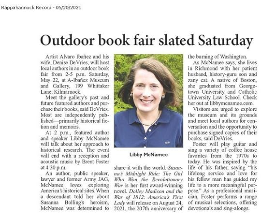 On the 4th of July, “Susanna’s Midnight Ride” turned three years old! Here’s a two-minute talk from Libby McNamee at the Yorktown Victory Monument, a memorial column with a Liberty statue commemorating the 1871 Battle Yorktown and the resulting peace treaties with the British.