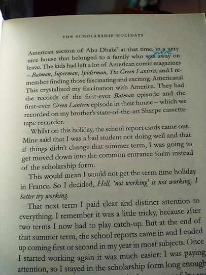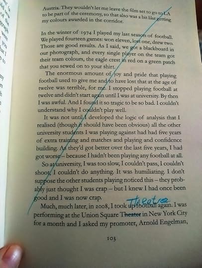 With regard to the entire pages that were struck through by the previous reader, those had to do with football. I’m guessing – not a fan. Although the notes from the former owner were banal and unnecessary, they didn’t detract from this wonderful autobiography. If anything, the corrections put me in mind of seeing an old friend at a party – not a rave, something ritzy with canapés and an occasional velouté – and the whole time the friend is trying to talk to you, the partner, who has only ever existed as a name in a Christmas card, jumps in to make mewling noises and add tiny details that nobody cares about. Which I suppose means that, though we’ve never met, I think of Suzy Eddie Izzard as a friend.