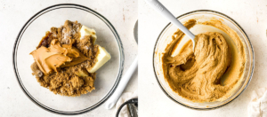 STEP TWO: Add the peanut butter, butter, brown sugar, granulated sugar, oil and vanilla to a large bowl and mix until smooth and well blended.
