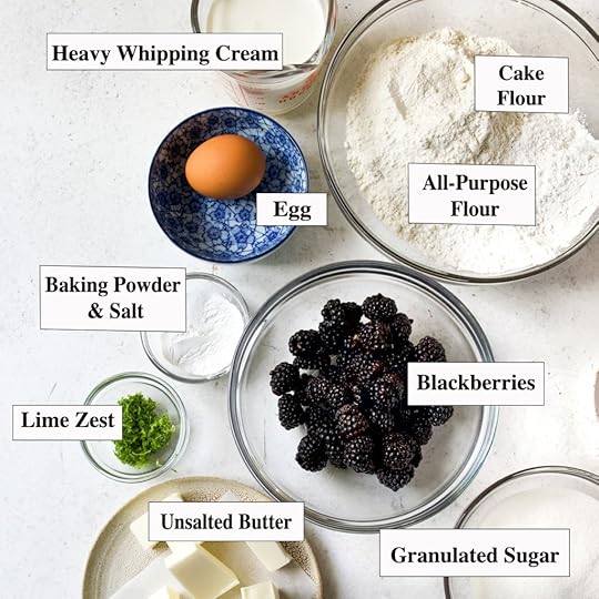 STEP ONE: Gather your scone ingredients: cake flour, all-purpose flour, granulated sugar, baking powder, salt, cinnamon (not pictured), lime zest, butter, heavy whipping cream, egg and fresh blackberries.