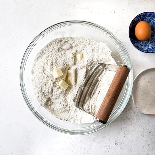STEP THREE: Cut in the butter, using a pastry blender or your hands, until you have small bits of butter about the size of an eraser on the end of a pencil.