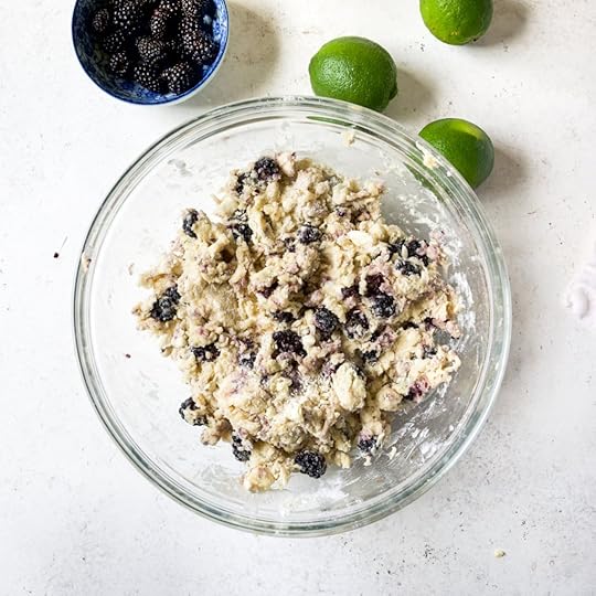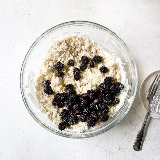 STEP FIVE: Add the blueberries and scoop the dough on top of them, gently pressing down. Repeat until the berries are mingling evenly throughout the dough.