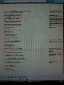 Get copyedited manuscript from David. The copy editor (the person who goes through the manuscript with a fine toothed comb and notices all sorts of errors) seessome really funny typos. Also, it is clear that I do not know how to use commas. CE also noticed some creepy typos. For example, on two separate occasions I use the word "widow" instead of "window." (color key to image below: yellow is the copyeditor, blue is my editor, red is me.)