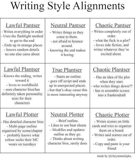 I'd call myself a Lawful Plantser -- aka just this side of pantser, or "plotting pants-ily" -- but I have been known to act as a Chaotic Plantser from time to time. Depends on where I am when an idea/scene strikes; if inspiration wakes me from a dead sleep, I'm scribbling on anything I can get my hands on: computer, phone notes app, grocery store receipt, torn-off scrap of paper, and I'm writing until I'm done. Whether or not it makes sense when the frenzy is over is completely arbitrary and honestly part of the fun.There are others out there like me, of course. It's delightful to see which professional writers share my writing style, and which ones are completely opposite of me. This Goodreads article takes six authors and tells you which camp they belong in. What does Stephen King write like? Did J.K. Rowling plan all her Harry Potter novels, or come up with the entire "wizarding world" as she went along? The answers are entertaining indeed.So, how does a pantser get anything done? And how long does it take to cobble together anything even resembling a literary work when there's not much of a plan involved? There are several methods to try when you want to get a project done quickly: I've participated in NaNoWriMo (National Novel Writing Month), an event that occurs every November and challenges participants to write 50,000 words -- the minimum length of a novel -- in 30 days. I've bought books that show you how to organize your ideas efficiently (this one in particular was helpful). And I've set writing goals (a page a day, x amount of words a day, a chapter a day, etc.).These methods were helpful and fun, and any time I give myself a challenge, I tend to become obsessive about completing it. But I've found that I get my quickest writing done when I just sit down and "pants" it -- no thinking, no following anyone else's guidelines, just running with the inspiration*.*Disclaimer:One of my favorite quotes by Octavia Butler urges us to forget inspiration, and many other writers have said that if they waited for inspiration, they'd never write. I believe this to be true, and have used this logic as motivation to develop daily writing habits when I've been working on novels. However, it's inspiration that lets me dive into a writing project without inhibitions (planning), and it's inspiration that keeps me up until 4 am writing. Writing every day is a habit, but inspiration keeps me frantically pantsing.At the end of the day, however we choose to go about the writing process just that: a choice. And it's not right or wrong or better or worse than anyone else's method. If it works, you're relaxed, you're consistent, and you're churning out results, feel free to pants or plot as you wish.