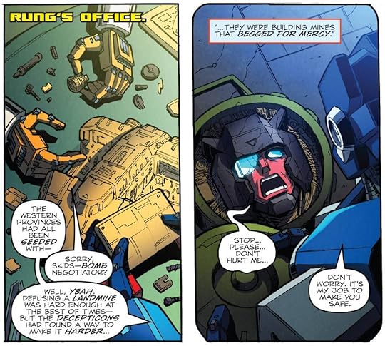 Because IDW really dug into the length and scope of the Transformers war in a way that no other version of the story ever has. It’s not just ‘good guys fight bad guys.’ This war has raged longer than humanity has existed. These war veterans have been getting many flavours of trauma embedded in their robot brains for millennia. There are Made-To-Order soldiers, thrown out of planes into battle seconds after they’re born. There are horrifying chemical weapons, there are torture camps, there are medical atrocities, there are terrifying prison systems – and a lot of that is from the Autobots, who are meant to be the ‘good guys’.