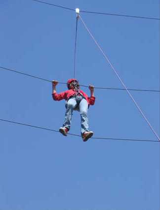Not me, unfortunately (from Camp Fire) – lots of old high-ropes photos but none of this.I love high-ropes. But when I was a kid, I hated the Postman’s Walk. Even now I find it hard to do. There are no poles, no dangling bits to hold onto to keep your balance – it’s just you and those two wires, a long way off the ground. And so in Nighingale’s Sword, Tal (who is the character I would like to be) has no problem with it, and Max (whose temperament I am much closer to in reality) also absolutely hates it. I know how it feels to be up there. Everything Max experiences in that moment, I’ve been through.