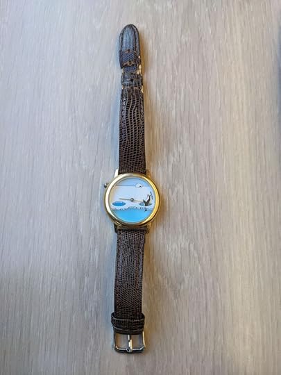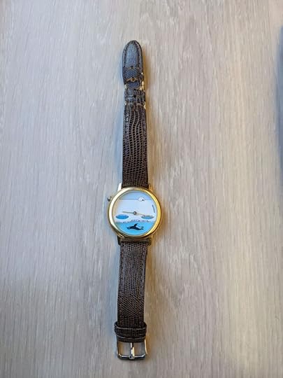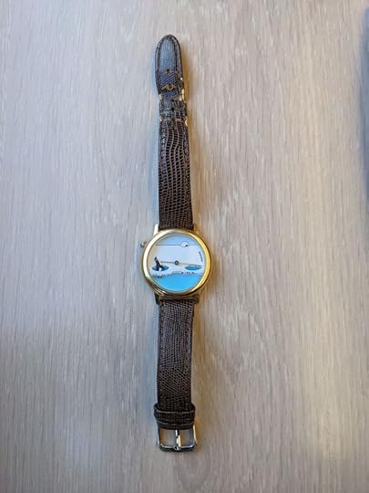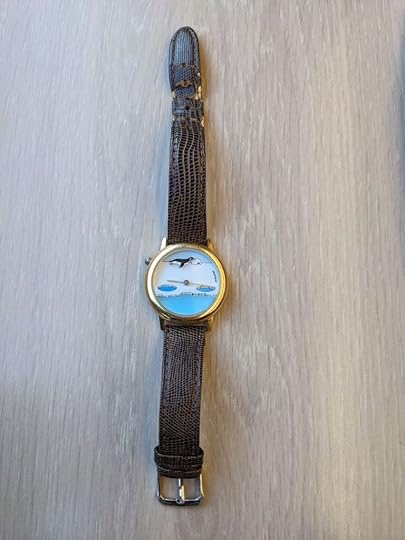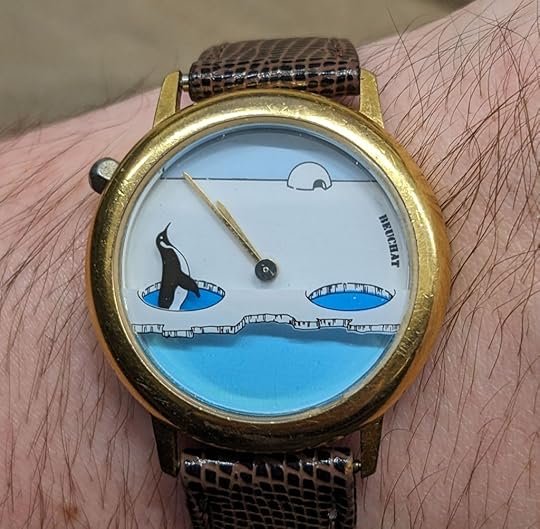 Yes, the penguin is the second hand. Yes, it dives in and out of the water every minute, a merry little soul living his best life. Yes, the strap is on the wrong way round, and I cannot for the life of me remember if I attached it wrong or if Granddad always had it that way; either is entirely possible. The penguin is a clear disc of plastic, the holes in the ice are printed on the back of the glass so it can dive ‘through’ them without breaking the illusion. I arbitrarily decided that the tip of the penguin’s beak is the ‘hand’, though this is moot as there are no numbers on the face for it to point to. It is a very stupid watch and I love it dearly.