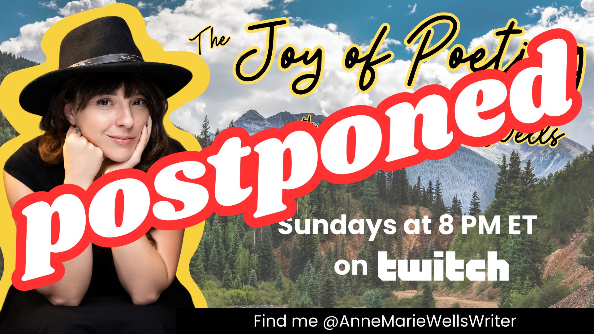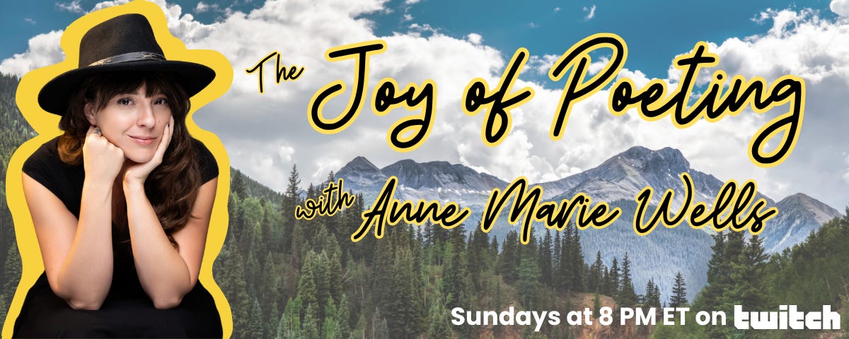A play on Bob Ross’ The Joy of Painting, I started The Joy of Poeting on Twitch. Each week (ish) on Sunday at 8 PM ET, I will walk viewers through creating a poem in a specific poetic form — Ribcages, Duplexes, Dippers, Burning Haibuns, Centos. AND I am going to challenge myself to write in meter too!