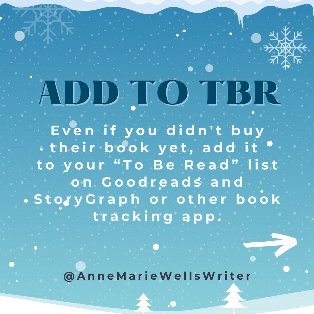 Even if you haven’t and can’t afford to purchase an author’s book, you can add it to your “To-Be-Read” list. On Goodreads, StoryGraph, and other book tracking apps, adding a book to your TBR list helps with those auto-populated searches I mentioned above. If you don’t use any of those apps, you can still post a Google-searched image of the book cover on your socials saying “I can’t wait to read this book!”
