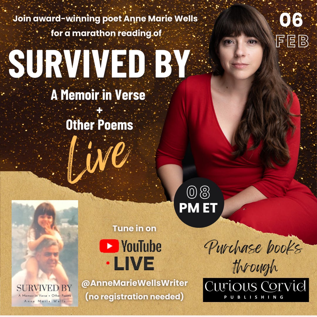 To honor my dad on February 6th, the anniversary of his death, I’m going to binge read my entire book, Survived By, live on YouTube. No registration needed. Just tune in on my YouTube page at 8 PM ET. As I read, I will also reflect on my words now five years later.