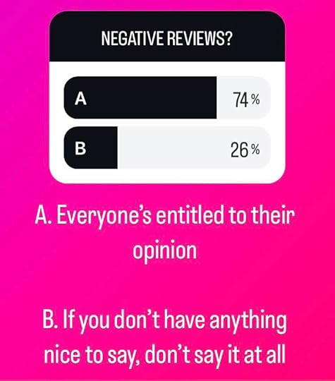 And I took to social mediaI asked my writer friends how they felt about giving negative reviews. I created a poll in my story. “What are your opinions on giving negative reviews?” I asked. “A. Everyone’s entitled to their opinion. Or B. If you have nothing nice to say, don’t say it at all. Or is there a gray area?”