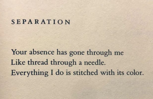 That’s not to say I can’t appreciate bite-sized poems. I can! W.S. Merwin’s “Separation” is a masterpiece in my mind: