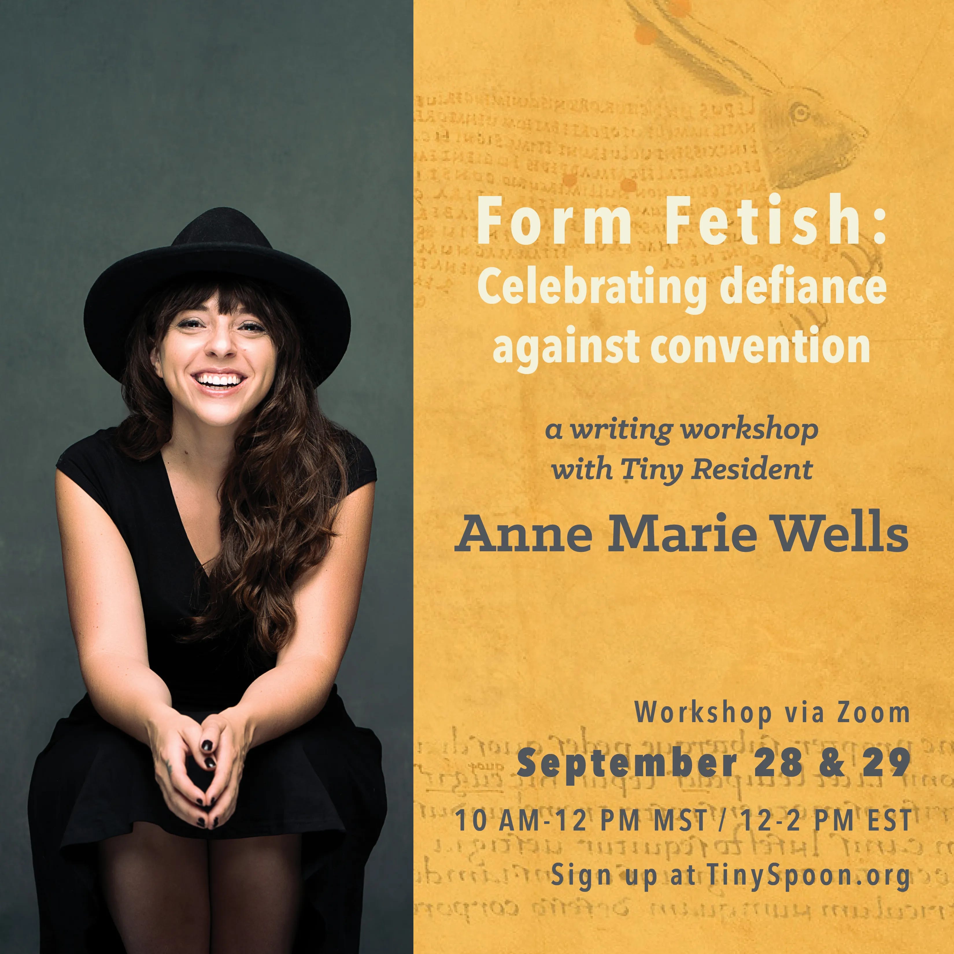 In this two-day workshop Anne Marie Wells will guide participants through a brief history of traditional poetic forms before diving heart first into modern poetic forms that give a throbbing middle finger to convention. Together, the group will explore constraint as a means of defying constraining societal structures as well as a means of experimentation and fun! Poetic forms don’t have to be metered or rhyming or trite. Poetic forms can be cultural, they can be political statements, they can contain secret messages, they can be puzzles, they can be math, they can be nonsensical, and they can be even more than all that when the participants in the class invent their own forms, adding to the diversity and beauty of the literary universe. This workshop is for the established form fetishist, the form curious, and form skeptics.
