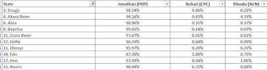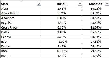 In 2015, the feat was repeated for Jonathan Goodluck of the PDP who received more than 92% of votes in the South South and South East, apart from Edo where he scored 57% and Imo (79%):