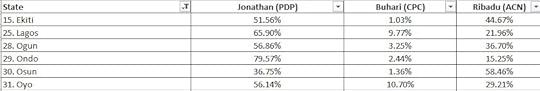 In 2011, the dominant party in the South West was ACN. The ACN, candidate was a Northerner, Ribadu. He only did better than Jonathan in one state, Osun, where he managed 58%: