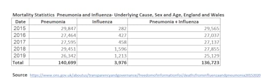 The Freedom of Information Act of Parliament dates back to 2000 (see it here). The act empowers citizens to request information held by public authority. Thanks to this act, sourcing the data needed to compare COVID19 and Influenza by mortality was easier than expected. On 30th of November 2020, somebody asked the ONS to provide the data it held on influenza mortality rate between 2015 and 2020. You can see the response from ONS here. The key outcome is this table, copied from the same location: