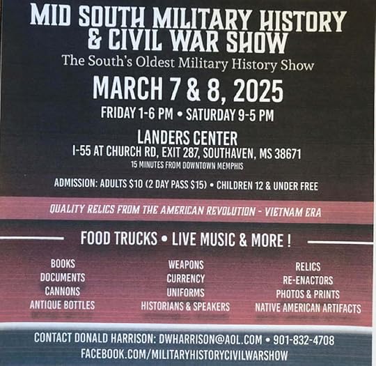 MID SOUTH MILITARY HISTORY & CIVIL WAR SHOW is the South’s Oldest Military History Show. It’s MARCH 7 & 8, 2025. Hours are FRIDAY 1-6 PM • SATURDAY 9-5 PM at the LANDERS CENTER, 4560 Venture Drive, Southaven, MS 38671Directions: 1-55 AT CHURCH RD, EXIT 287, SOUTHAVEN, MS 38671, 15 MINUTES FROM DOWNTOWN MEMPHIS.ADMISSION: ADULTS $10 (2 DAY PASS $15) • CHILDREN 12 & UNDER FREEI hope to see you there!